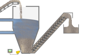 Mit einer Schneckenpumpe werden das Schmutzwasser und die darin enthaltenen Schwimmstoffe auf ein höheres Niveau angehoben und fließen in natürlichem Gefälle in die Kläranlage. Die Niveaumessung im Einlaufschacht steuert den wirtschaftlichen Einsatz der Pumpen.
