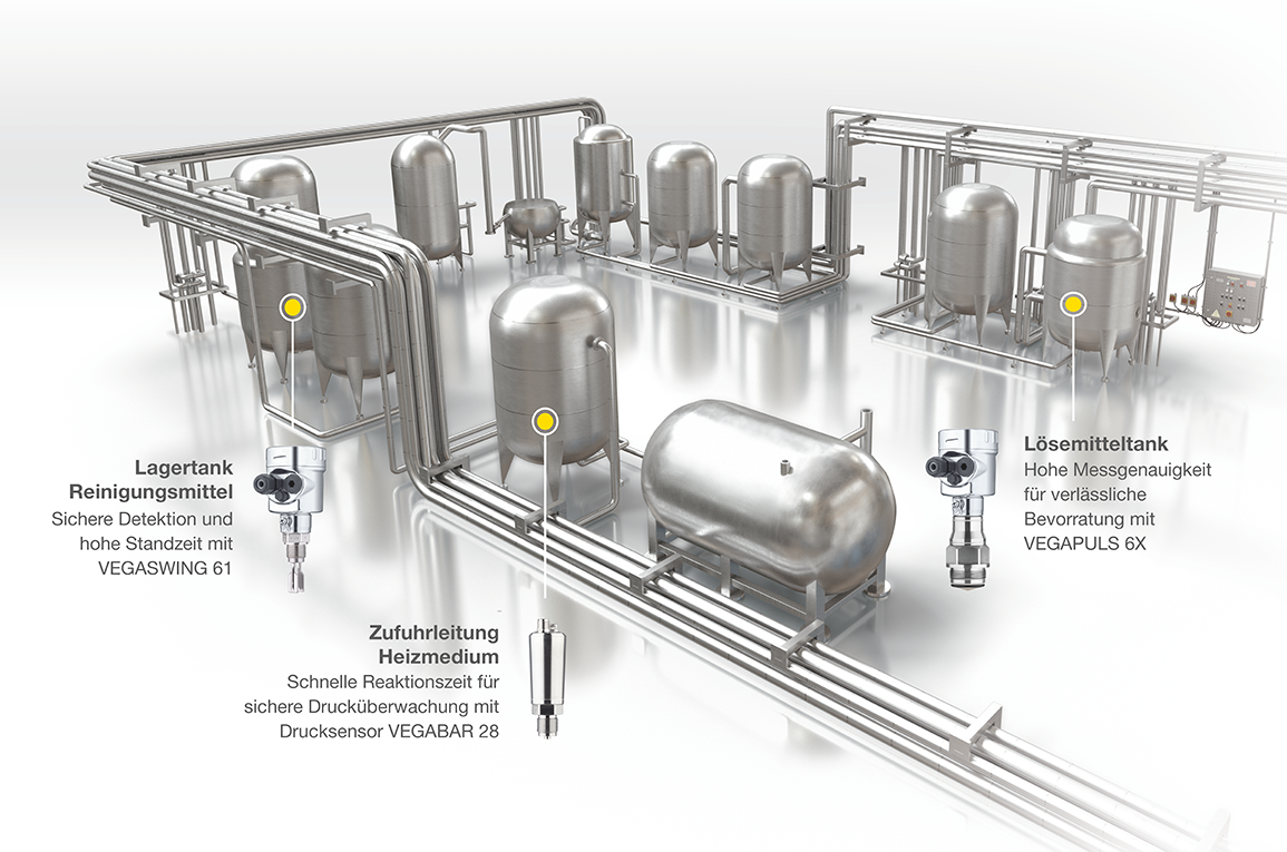 VEGA-Sensoren sind perfekt auf die kritischen Aspekte der CIP- und SIP-Prozesse ausgelegt: Selbst im laufenden Betrieb und bei bis zu 150 °C stellen sie sicher, dass alle benötigten Medien mit ausreichend Reserve zur Verfügung stehen.