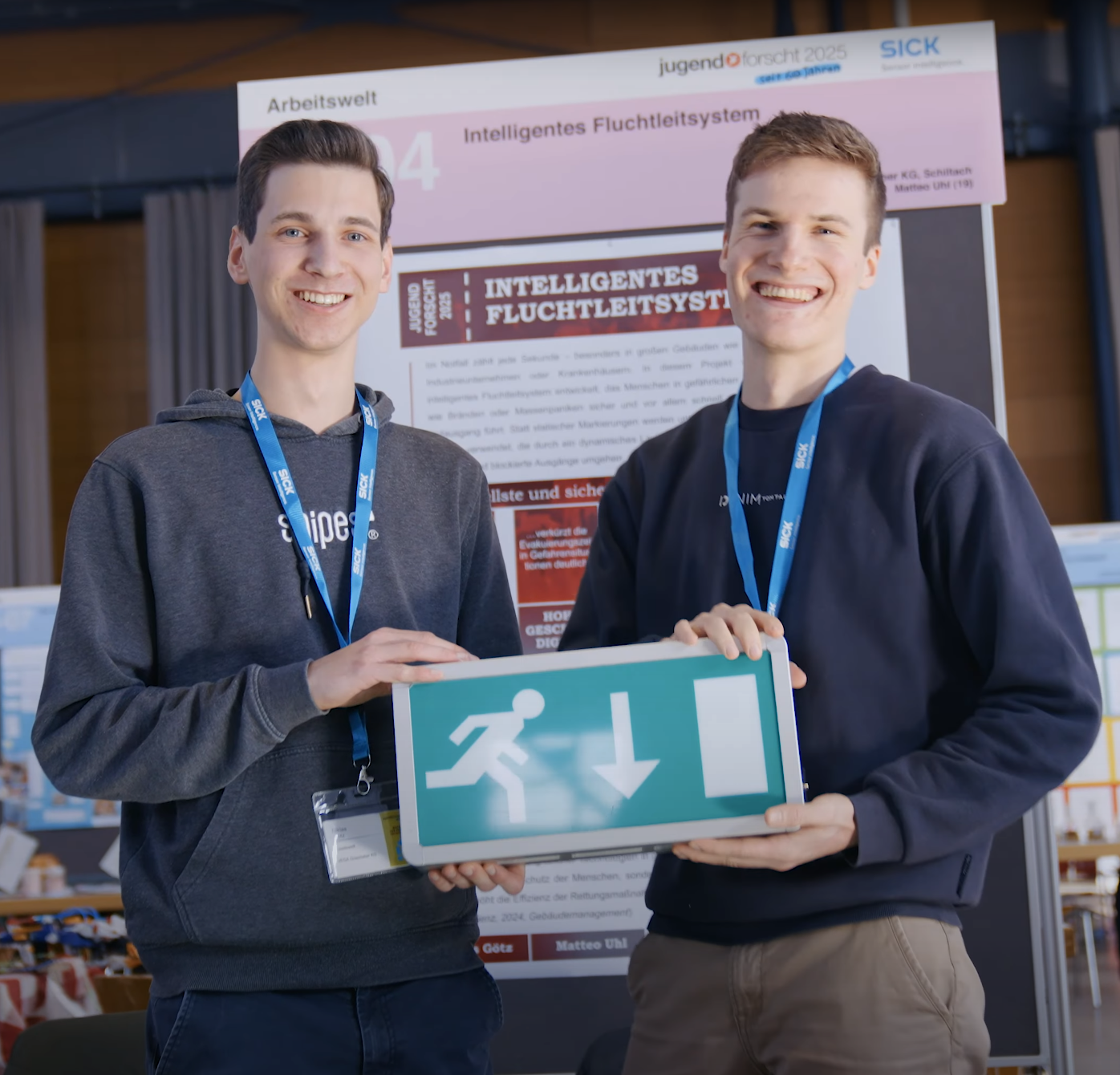 Das Team von Matteo und Niklas hat ein „intelligentes Fluchtleitsystem“ entwickelt. Dieses führt Menschen in gefährlichen Situationen wie Bränden oder Massenpaniken sicher und vor allem schnell zum nächsten Notausgang. Hierbei werden RGB-LED-Streifen anstelle von statischen Markierungen, wie beispielsweise im Flugzeug, verwendet. Durch ein dynamisches Lauflicht zeigen sie den sichersten Fluchtweg an.